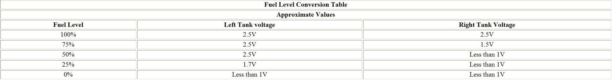 When you fill up your car the left tank sender increase first 0-2.5 volt when your gage moves from 0-50 % and when you fill 50-100% your right sender increase from 0-2.5volt (shown in the table below.