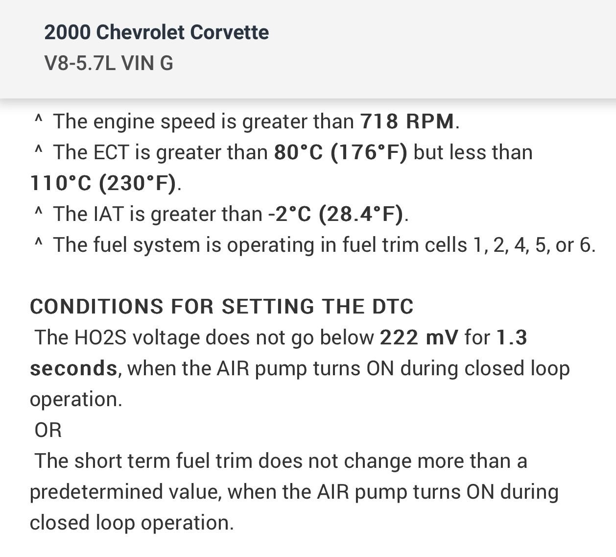 Below is the criteria which sets that DTC…with a bidirectional scan tool you can actually activate the AIR system and watch the O2 sensor voltage drop below 222 mV verifying the system is operating correctly.