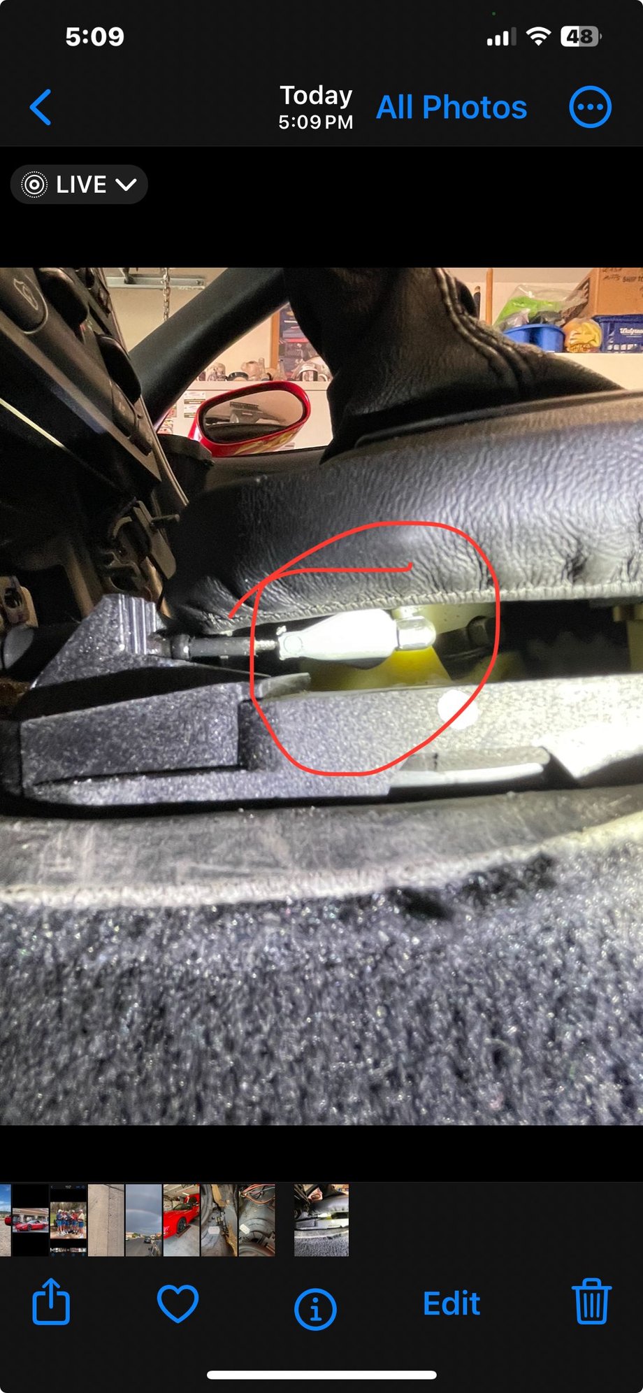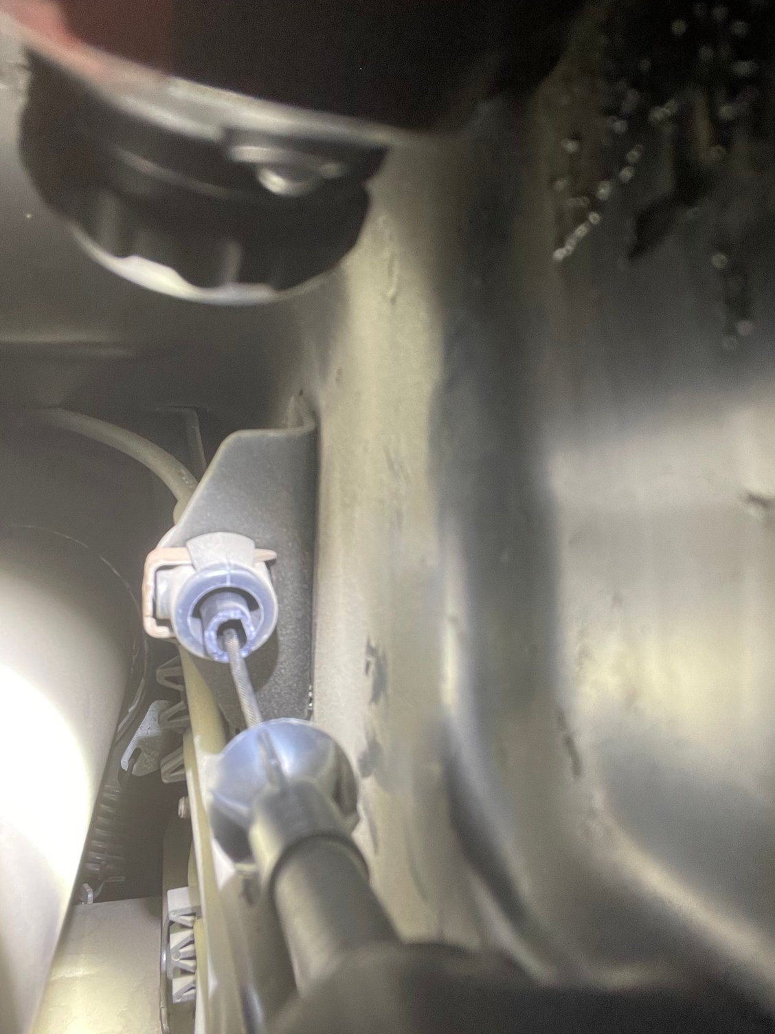 Broken/cracked guide/support for the shifter cable in the tunnel. Will have to replace the cable assembly. 🫣