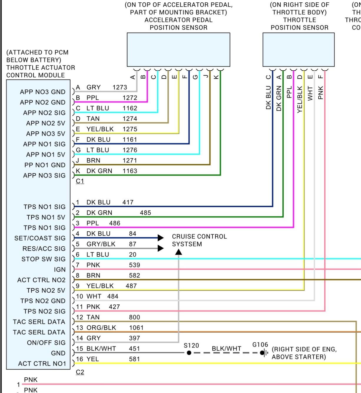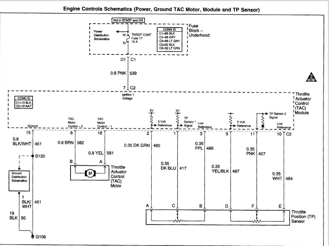 I have gone thru all the wires from the TAC to the TPS connector and they all have continuity along with the ground on the block. I don't have any voltage at the TAC connector on the pink ignition wire or the 2 DK Green and Dk Blue wires. I also tried checking for 12V on the Pink ignition wire with plug disconnected from the TAC and still have nothing, fuse 17 is good, I'm at a lose.