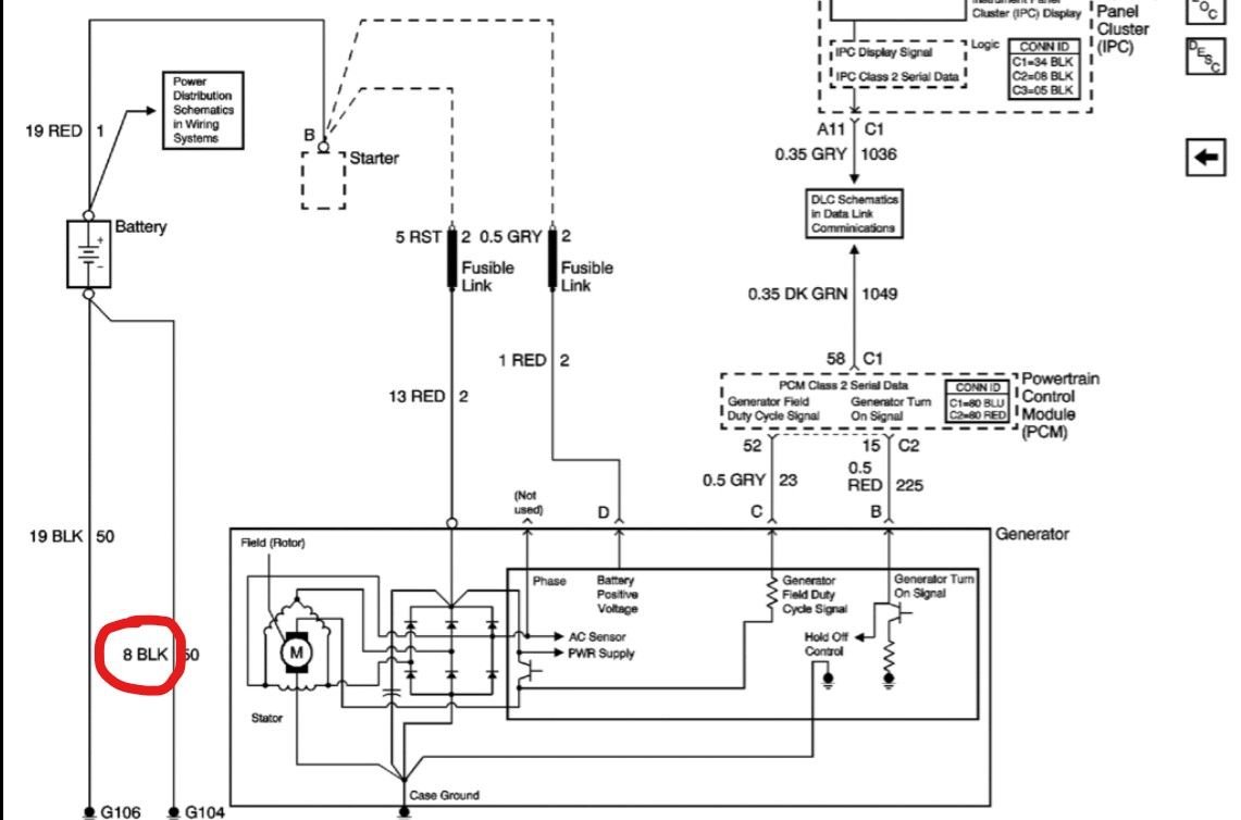 Negative cable - Block above starter (G106) and frame (G104)