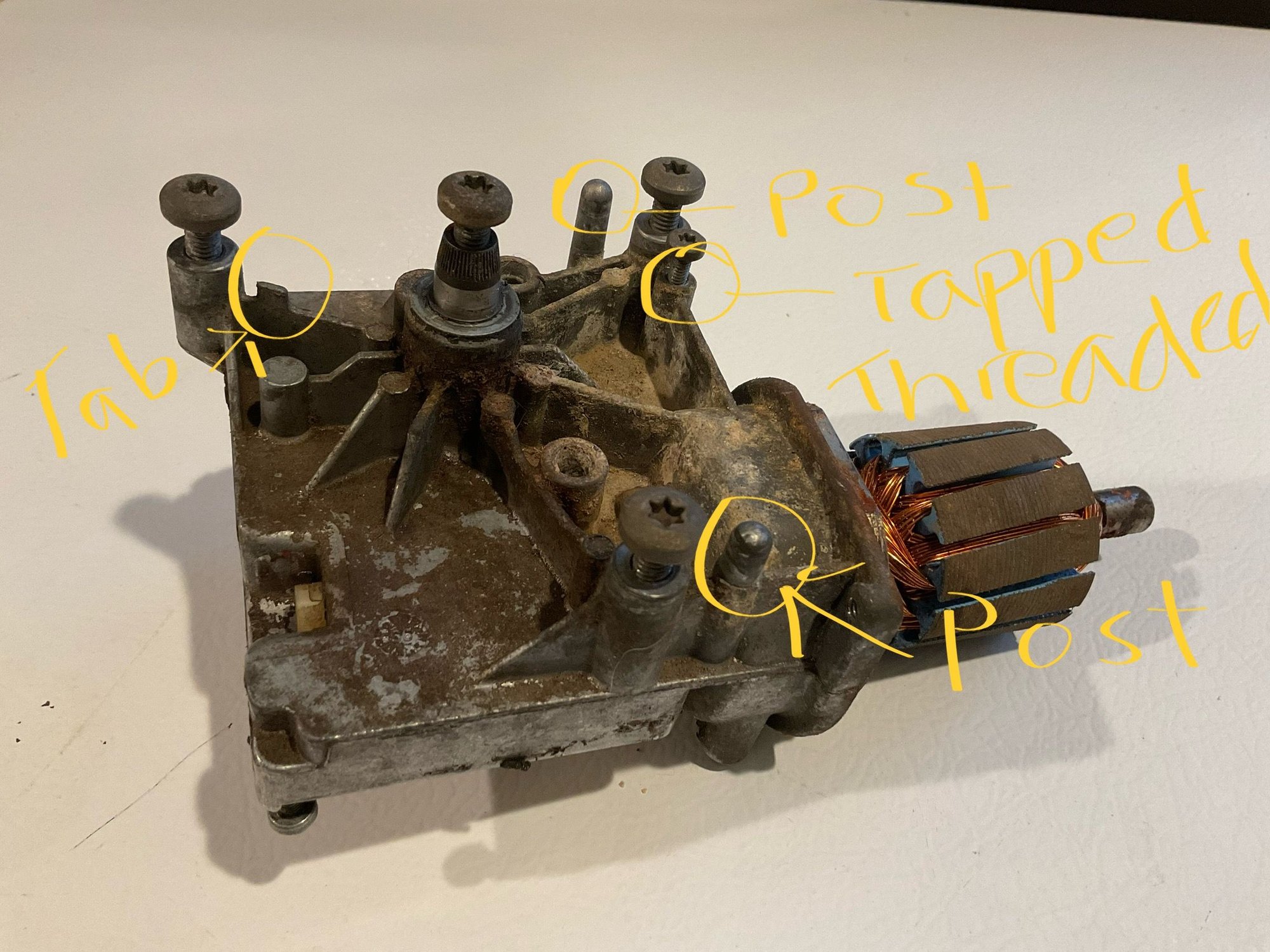 Following image is the OE wiper motor disassembled. The circled elements note the specific casting attributes for a 1999 C5.
