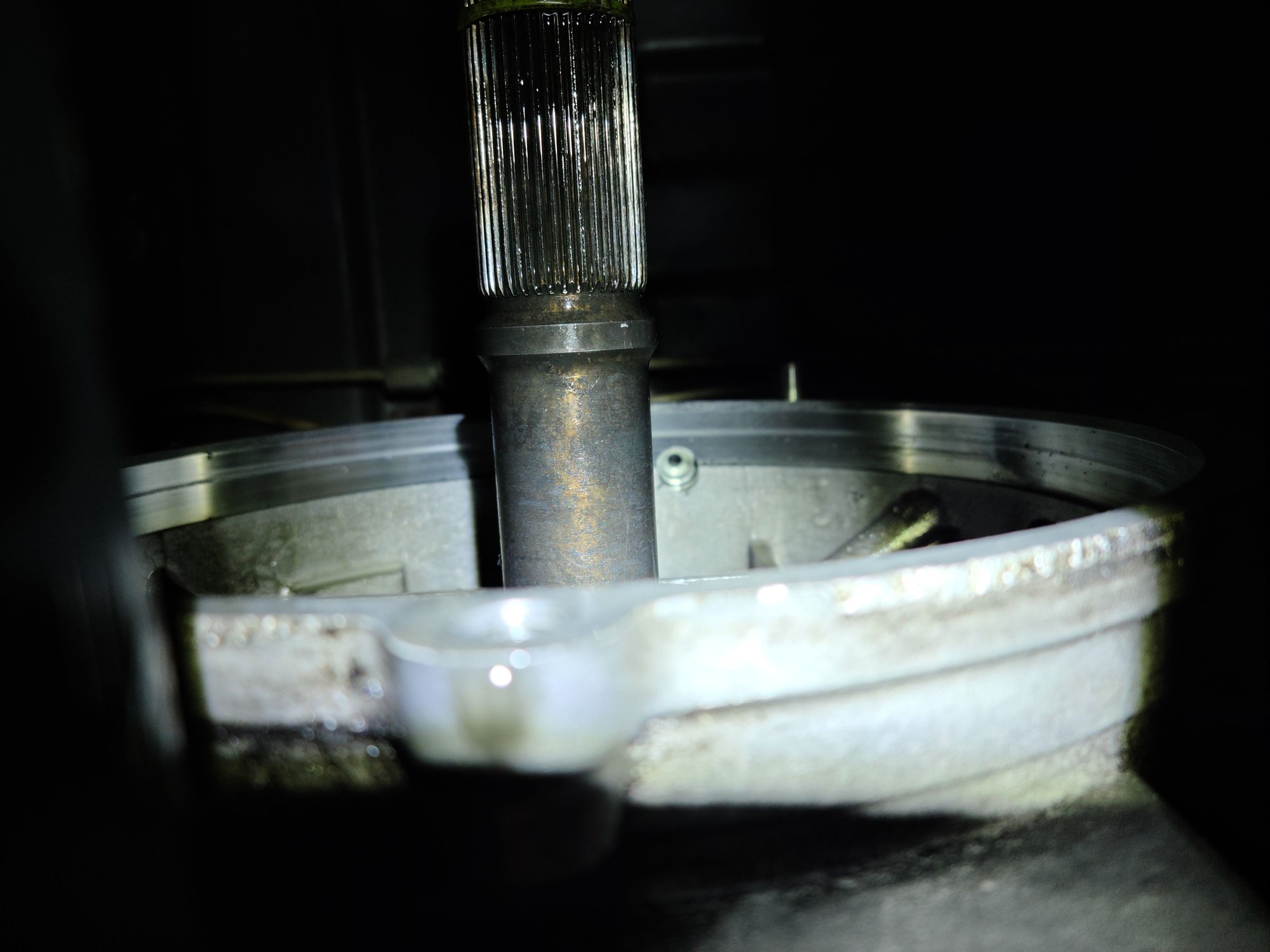 At this point, I already had my diff side covers off. Even tho I'm working on a 4 post lift, I still couldn't get my head up there to see it. I did get a bit of a look at it with a mirror and I got a pic with my camera, but those confirmed that there wasn't enough length to securely clamp a hose to. With the driver's side diff cover off, I could look up into the diff and see the bottom of the vent. That's it just to the right of the axle in the pic.