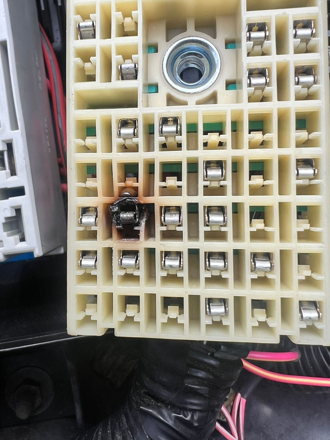 What is going on, is the U connector that the relay fuse spade clips into, it either bend open, burnt, or the wire trace that connects to the side of it burnt/corroded, and the real problem that is causing all the heat at the upper blocks male spade connector that is transferring down to the lower block connector.