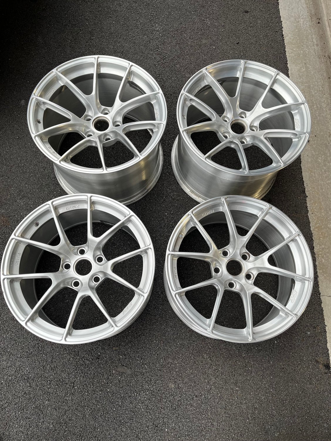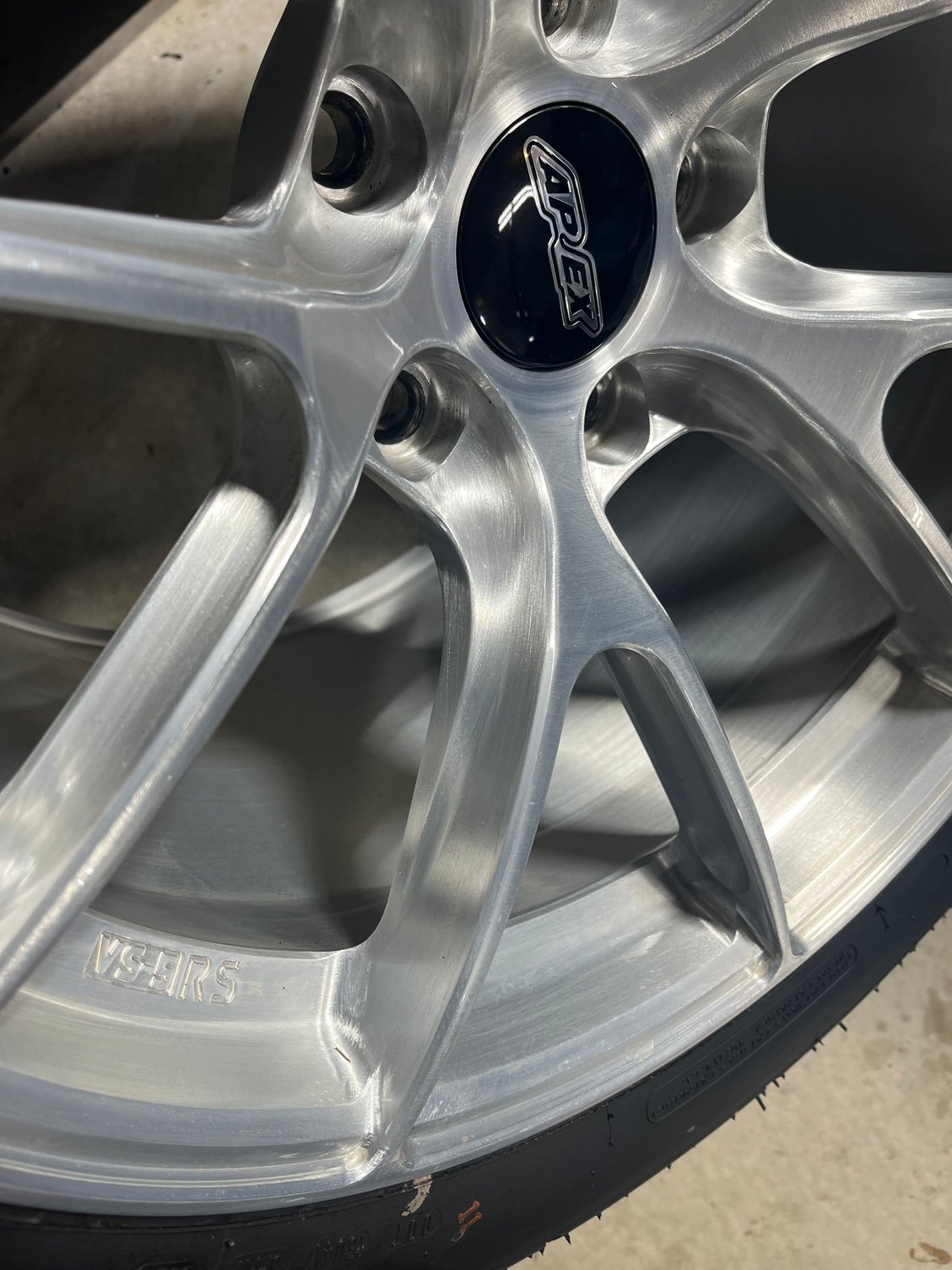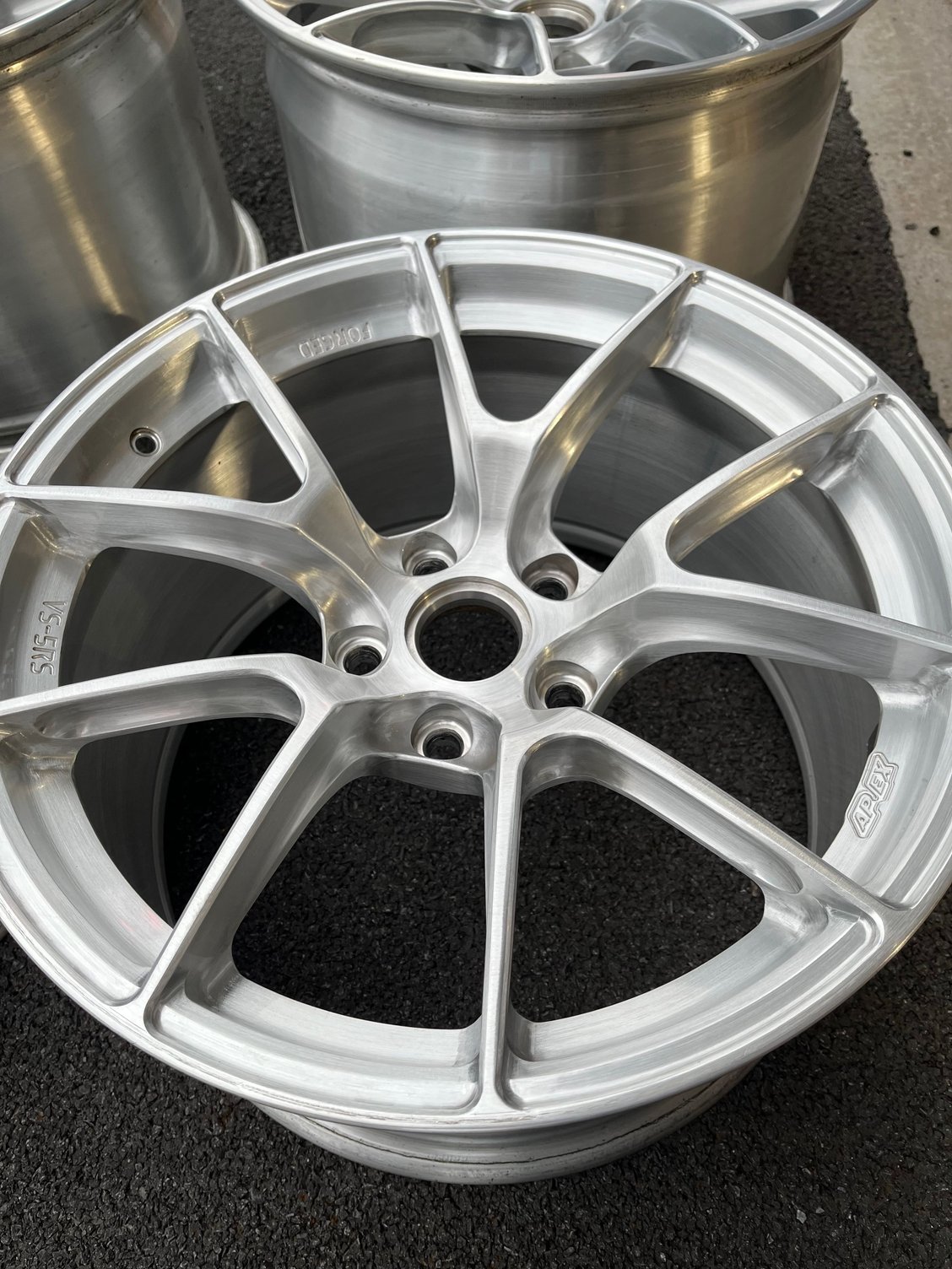 Complete set of Apex forged VS-5RS wheels in excellent condition and very clean. Color/finish is brushed clear. The wheels have less than 1000 miles on them and have no damage, repairs, or curb marks.