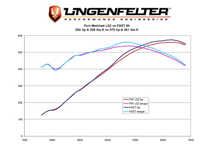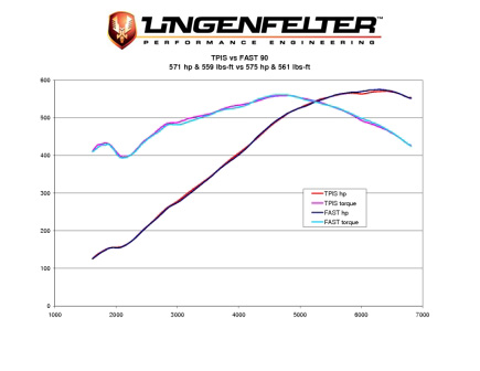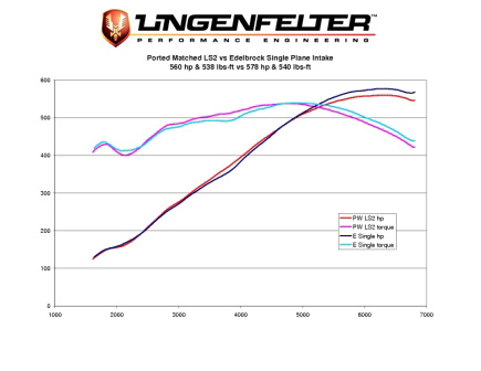Here is an engine dyno graph of the TPIS intake on an engine compared to a port matched LS2 intake.
