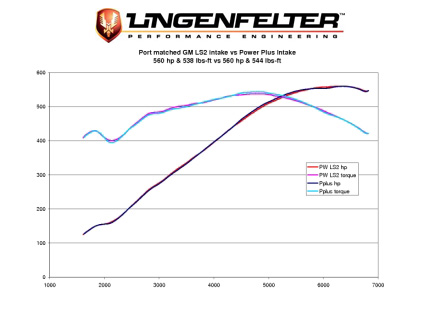 Here is a dyno graph of the PowerPlus LS2 intake. This was an early pre-release casting so they may have made some changes to the tooling. The LS2 intake was port matched. The PowerPlus intake was as received (stock).