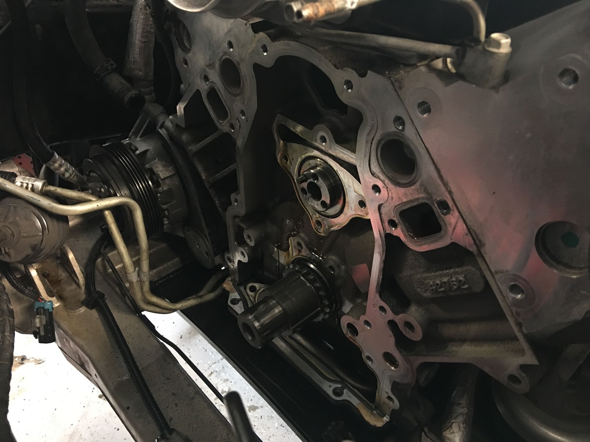 Now you should have enough room to pull the balancer, oil pump and front cover off. If it's still a tight fit you might have to remove the lower shock mounts to the control arms. I believe that's two 13mm bolts on each side.