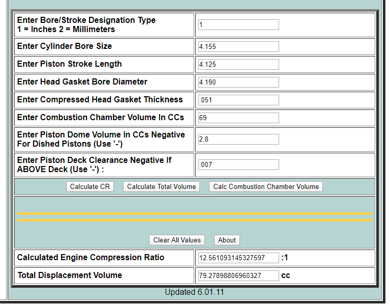Also, when looking into this for you I've realized I've been entering my domed pistons into this calculator as -2.8 but the negative is for dished pistons. So my CR is about .5 higher than I thought, lol. Oops.