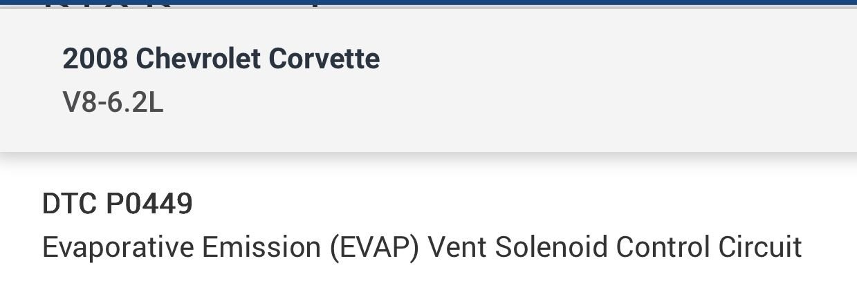As for P0449, disconnect the evap connector in back of car, put the car in run/motor off mode by pushing the bottom of start button for 5 seconds, and make sure you have 12 volts across the two connector pins for the evap. If you don't have 12 volts, then trace the wires back up the main connector above, disconnect the connector and check for voltage on the two wire pins on the ecm side of the connector. If voltage there, but not down line at back of car, then check the wires for continuity front to back each, and if you have a problem, going to be on the white 24 gauge wire, and at the S bend just before the thick plastic shield where the loom is connected to torque tube. if wire is cracked, don't bother splicing the connector, but pull a larger white shield wire, to replace the 24 gauge wire in the first place. Spice may hold for say a year, but with how thin the wire is, and it already cracked once, just a mater of time until it just cracks a few inches away from the splice again.