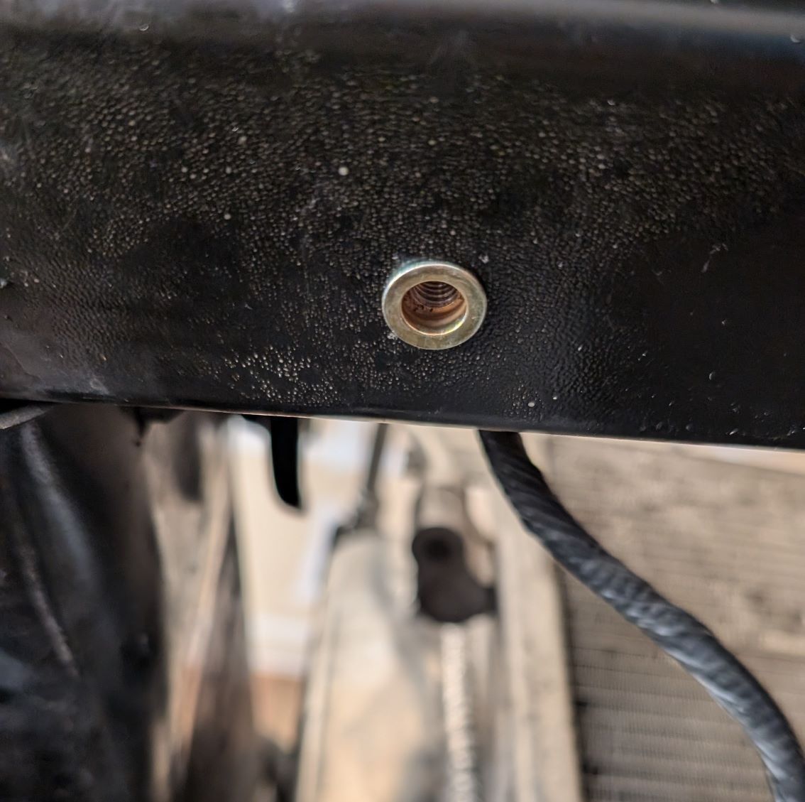 My solution was to install M6 rivnuts, and secure the intercooler with some spare M6 bolts: