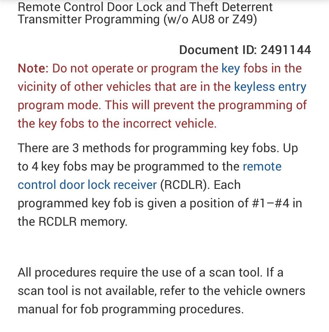 You can select FOB1 as the one you want programmed with the Tech 2...the most important thing is to make sure the ignition is OFF during the procedure with the Tech 2 and at the end make sure you press the UNLOCK button on the new FOB per step 8...procedure from Service Info below...car covered in a carport ??...that sucks !!