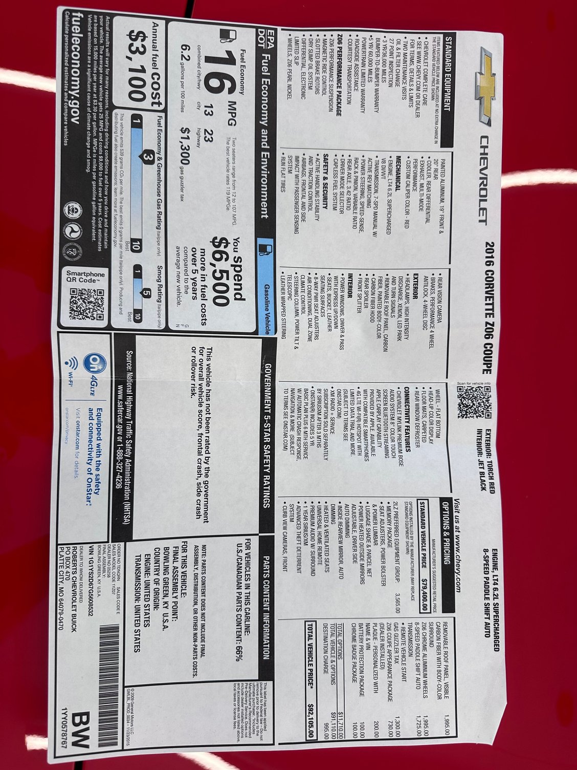 FS: 2016 Z06 2LZ Auto Torch Red/Jet Black 5353 Miles Local 1 Owner KS 100% Original