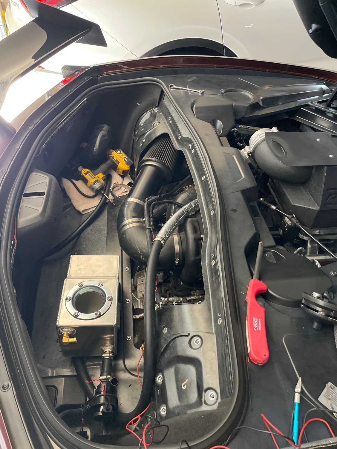 Finally got project vanilla ice c8 done. Separate icetank for our test mule. Basically left procharger stage II stock reservoir and pump and added a new tank and pump, re routed waterflow and ran a new circuit for the new pump with switched power. Hopefully the SC bricks will be filled with ice water and reduce intake temps before it goes in chamber. According to procharger prolly the first one outhere with dual pump ice tank. Chk it out. Testing this week.