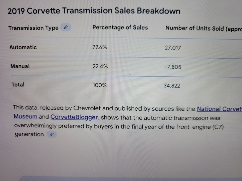 You are making my point which is by gm killing off the manual for 8 years it has left a big pool of customer that would only buy a c8 with a manual, hence my comment. While they were only selling a quarter of c7s with the manual, if you take a big chunk of that group over an 8 year period you build up a sizeable demand.
