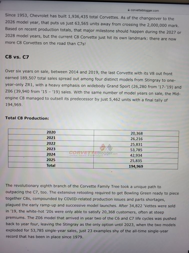 Wow, didn't realize that C8 sales tanked so bad in 2025. I guess everyone who wants one got one by now, no real reason to trade up since its the same car with some minor interior changes. A new engine, GS and/or manual would produce a lot a sales. If 20% want a manual, that means there is pent up demand of close to 40 thousand cars....