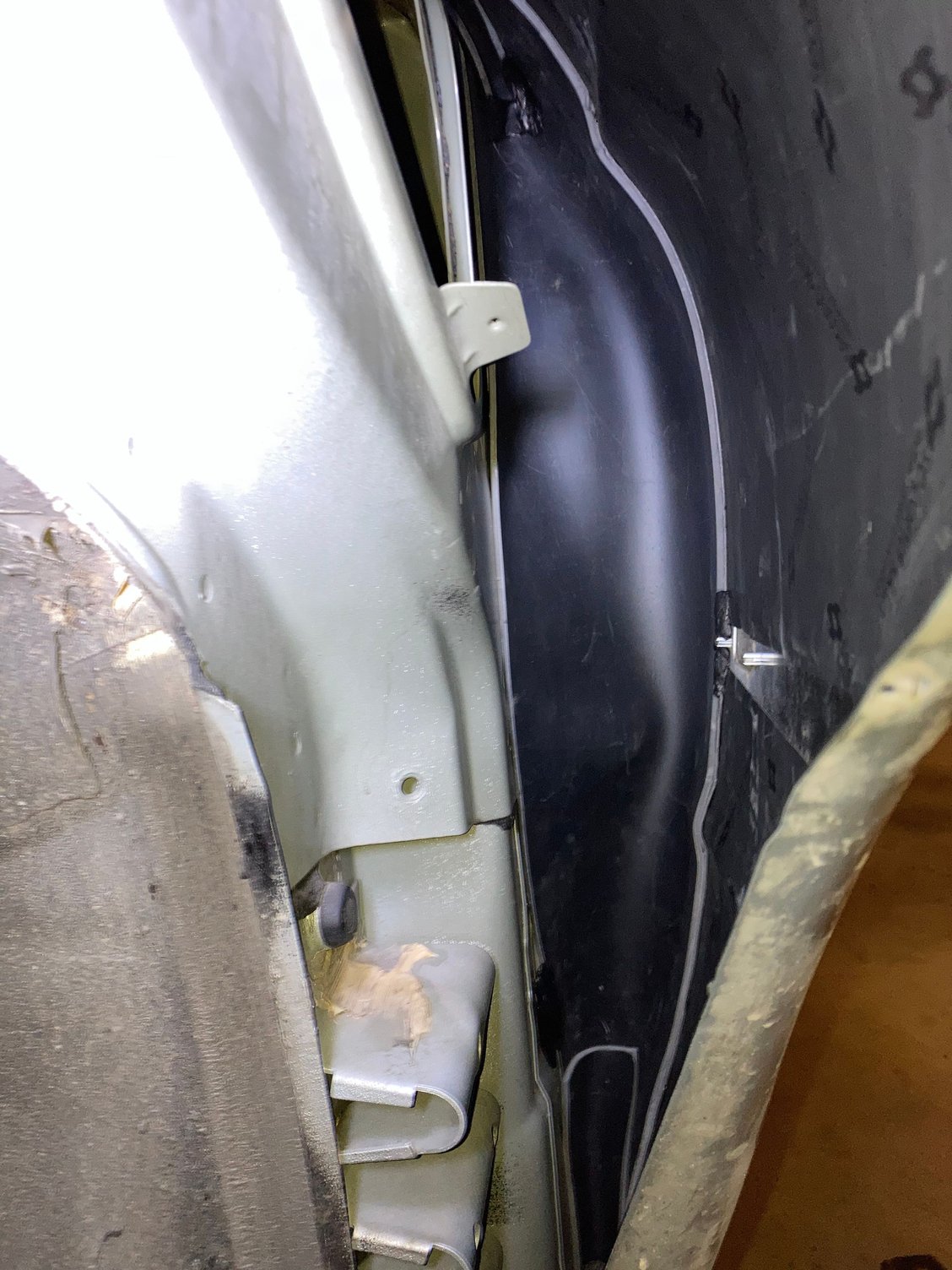In that vehicle, I also put MLV at the trailing edge of the front fender, to stop tire noise from entering the leading door edge. Here's a pic from the front wheel well, looking back toward the door. CLD on the fender (right side of pic) to stop if from resonating, and then MLV to stop airborne noise from the tire entering the door.