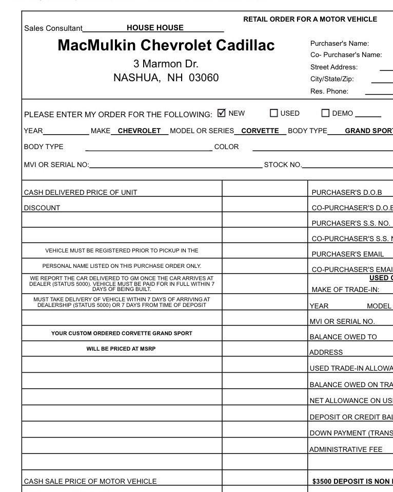 Just a heads up to those who haven’t gotten a chance to look into ordering info. I just sent a deposit to MacMulkin Chevrolet for a GS allocation. The deposit fee is $3,500, they said that they have 9 names on an “unofficial list” so far. I’ve been in contact with Adam for a few weeks now, as well as Adrian. Both are extremely professional and easy to work with. So far the experience has been as smooth as I’ve expected from them. They told me they expect allocation numbers to arrive at the end of the month, and that they expect deliveries around the start of summer.