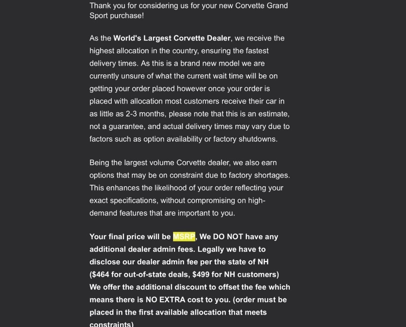 Also we have to keep in mind that this is just the lowly GS, I’m sure GSX, ZR1 and ZR1X order numbers look vastly different than this. My friend placed an order with MacMulkin when the Z06 came out; he was number 650 ish and it took him two years to get down into the 100s, by then he ended up canceling his order before going to 2000 status (at which point your deposit becomes non-refundable).