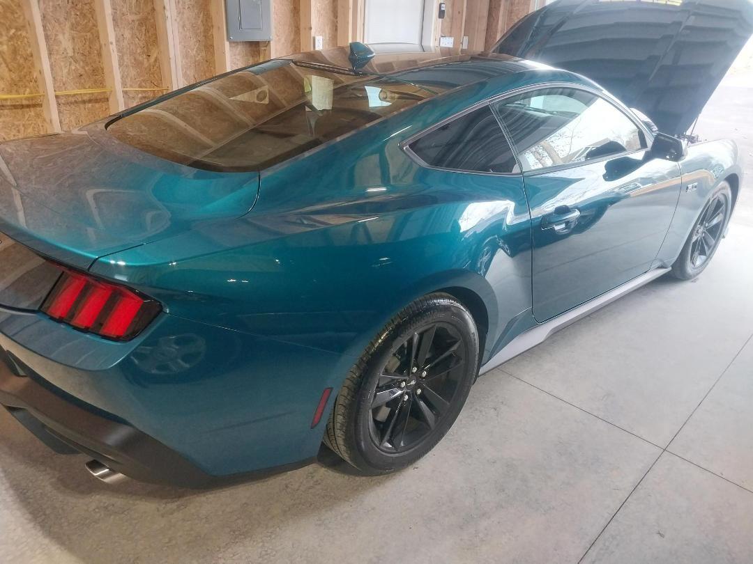 2026 Ford Mustang GT coupe in Adriatic Blue. Base model, cloth seats, rear spoiler delete, six-speed Getrag manual transmission. Only 900 miles on it in three months!