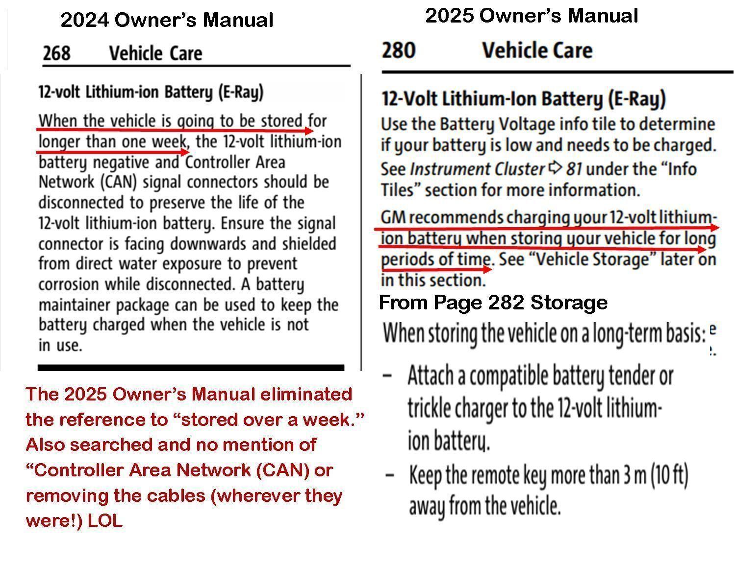 RKCRLR's speculation is interesting BUT IMO the GM misstatement re the Li-Ion 12 volt battery did not relate to Lead Acid Batteries. No explanation of why it was in the 2024 Owner's Manual. Putting the E-Ray 12 volt Li-Ion battery on a charger weekly is not logical. As Tadge agreed in the Jay Leno video and his statement to me in an Email, quoting: "Li batteries are actually better than lead-acid for sit-time." All reports reports say is true, with some stating it can "sit" for several months and still start the car.