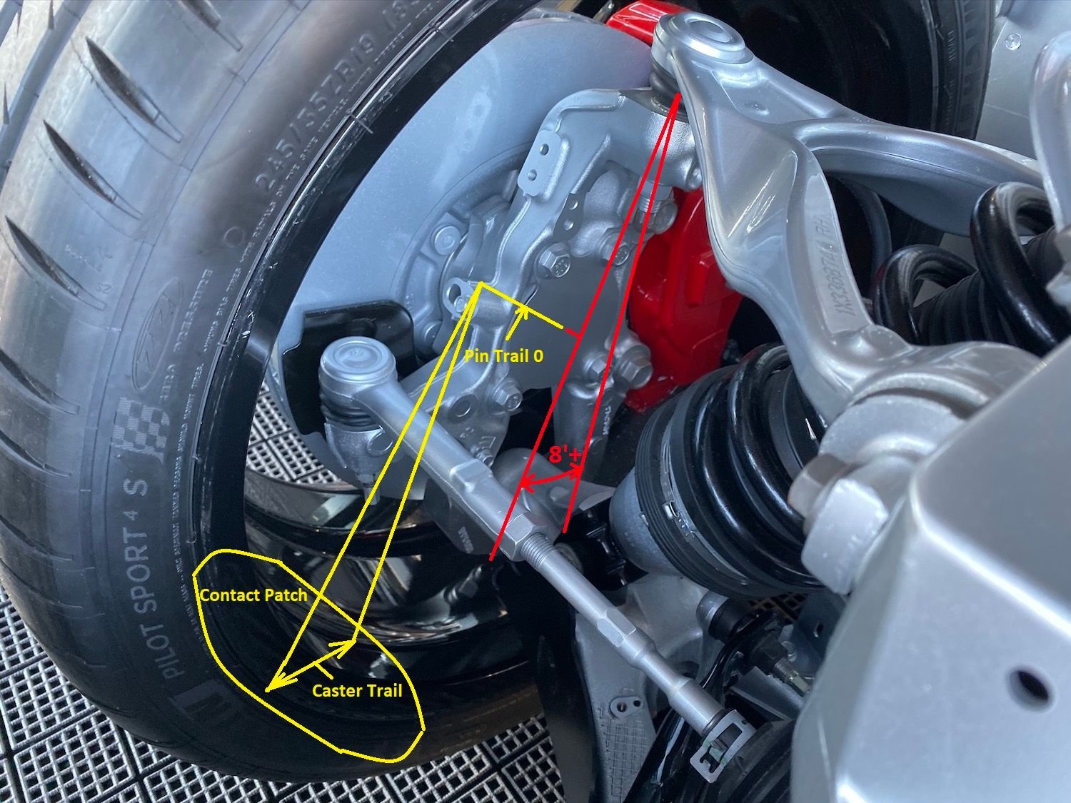 After this elaborate exercise, you can then determine the steer you will achieve at your new ride height. The Porsche has 9'+ caster. Generally, I design for tow in in droop and tow out for compression. Not so good for street. You can't change the location of the steering rack or change Ackerman in the C8.
