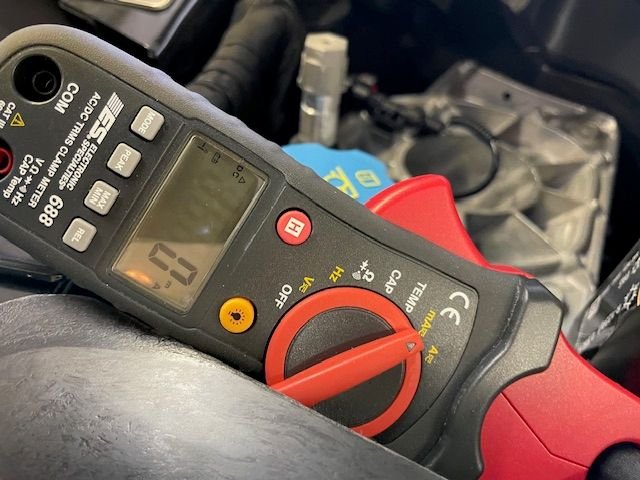 Photo shows clampmeter on negative battery cable - 0'd out to read "relative current". There is a parasitic battery draw of about 10 mA that is zeroed out for the relative reading.