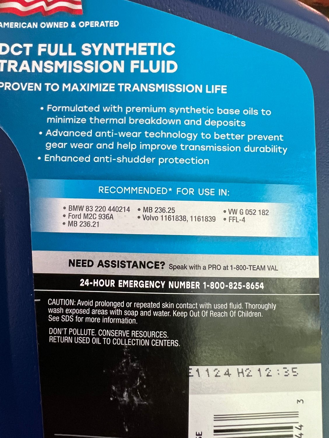 My points were really just 1) TREMEC and GM recommend specific products (Pentosin FFL-4, Fuchs Titan FFL-4, and Delco DCTF FFL-4 depending on where you look) but do not references a "specification". 2) FFL-4 is not a specifcation - there is no approving or licensing authority - unlike API, or dexos, or GETRAG etc., 3) the Valvoline Dual Clutch Transmission Fluid lists recommended uses, but list no specification approvals or licenses.