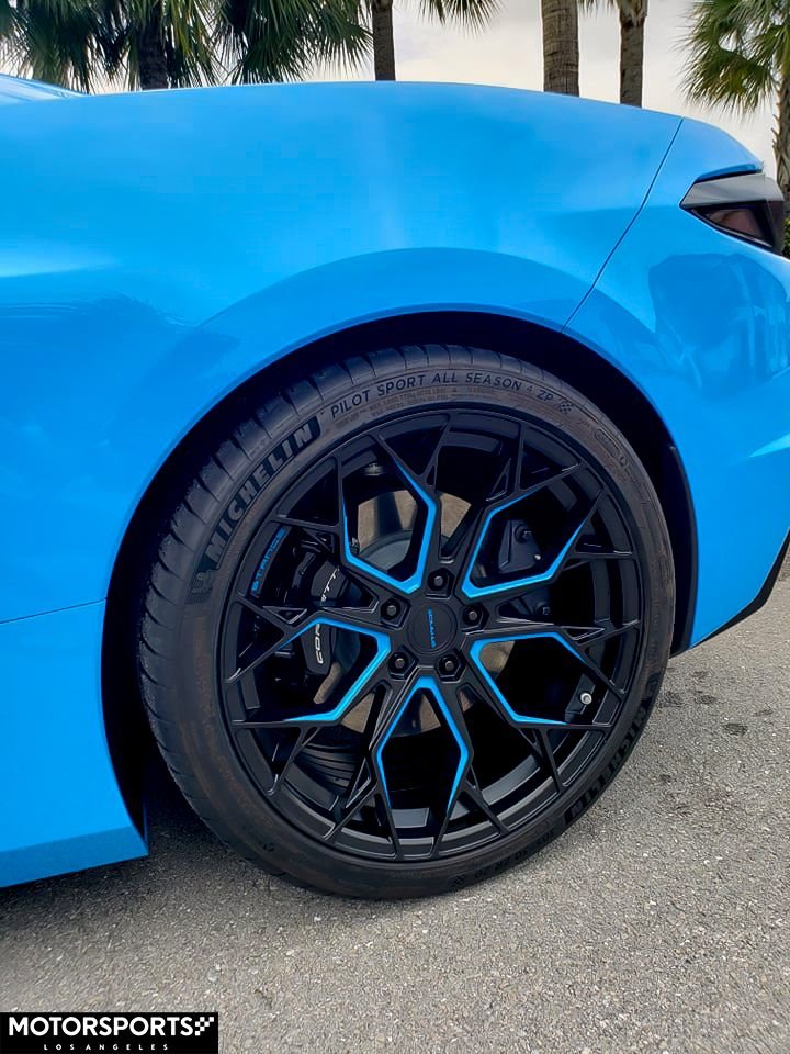 Sneak Peek from our good customers Rapid Blue C8 getting the Stance SF10 wheels in Matte Black & color matched Rapid Blue accents