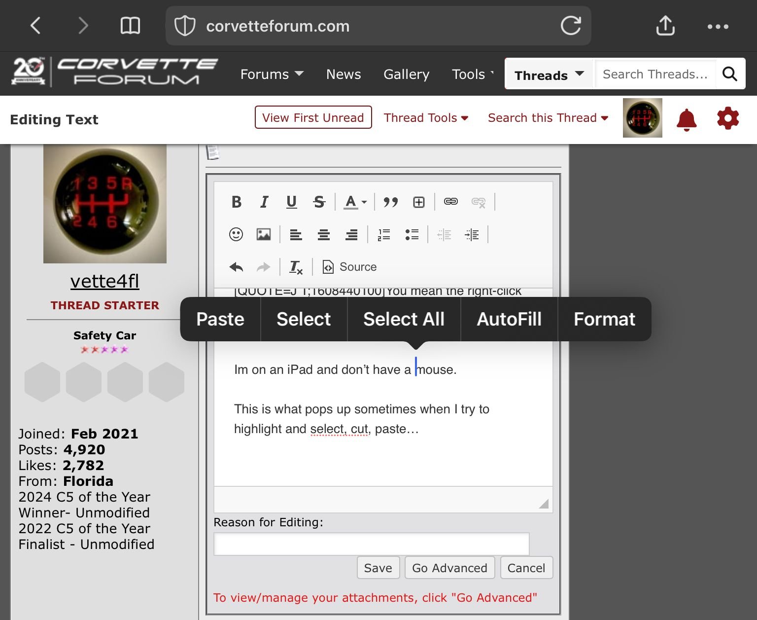 I will say that the editor that we use, the "right-click" context menu doesn't always have the Copy/Paste/Select functions included. That is a known issue with the editor but that isn't new.