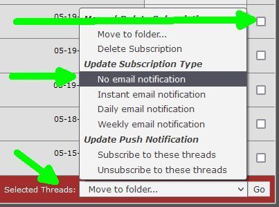 All subscribed threads will be listed along with current subscription status. Select those you want to change, or use the Check/Uncheck All box to mass-select from the table's header, then change the options for that thread with the bottom-right drop-down menu: