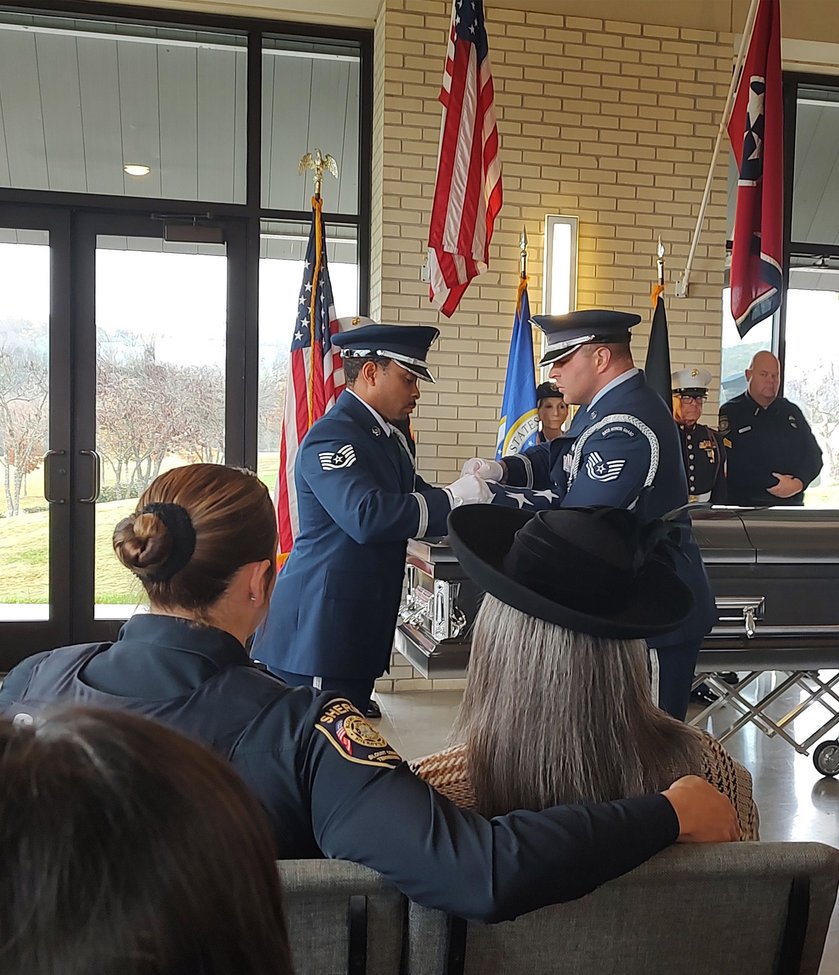 There was a color guard (USAF and US Marines) and a rifle team outside and out of view to me. An AF chaplain spoke. The rifle team fired a salute, Taps was played, the flag on Chuck's casket was folded and presented to the fiance.