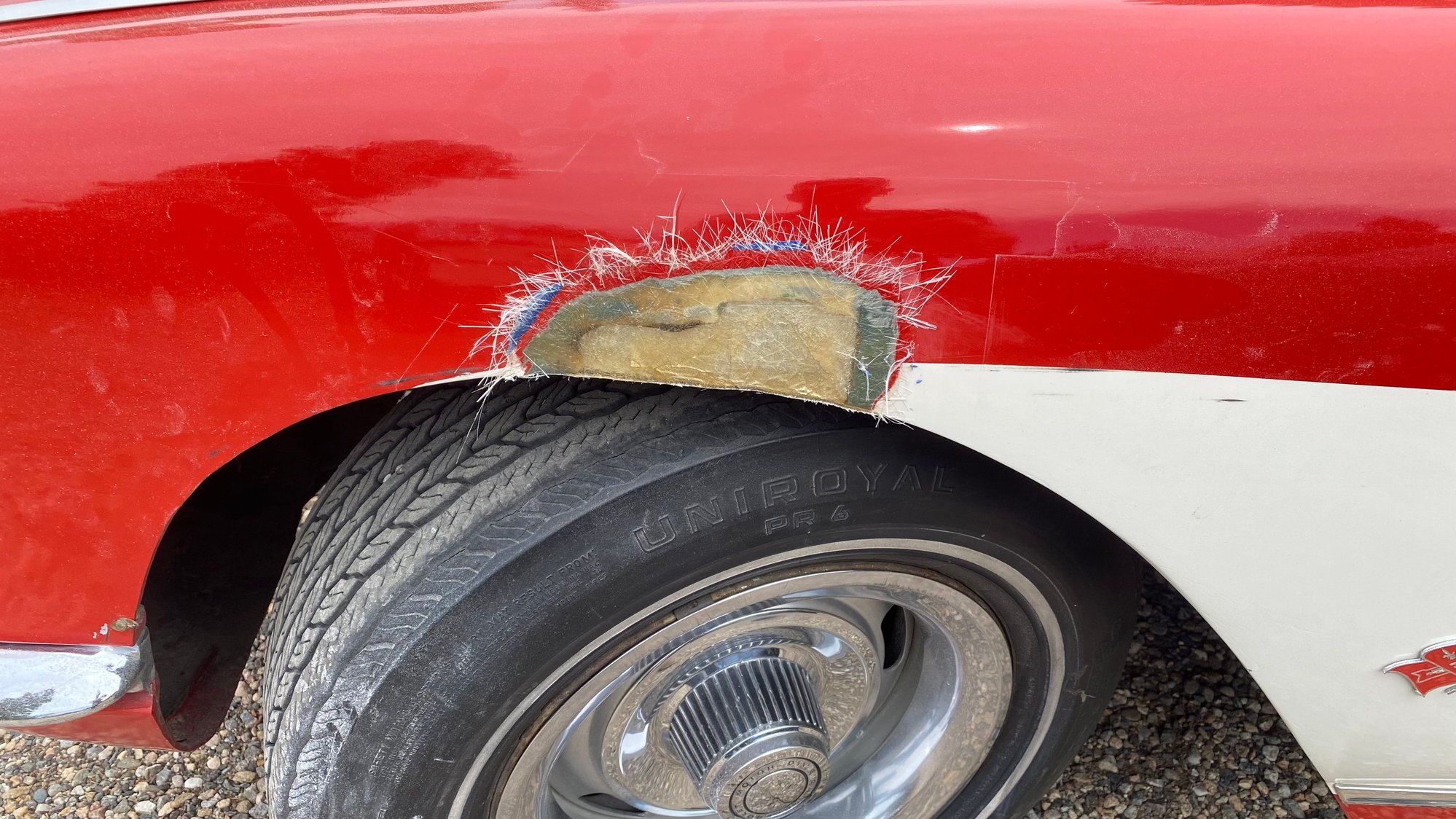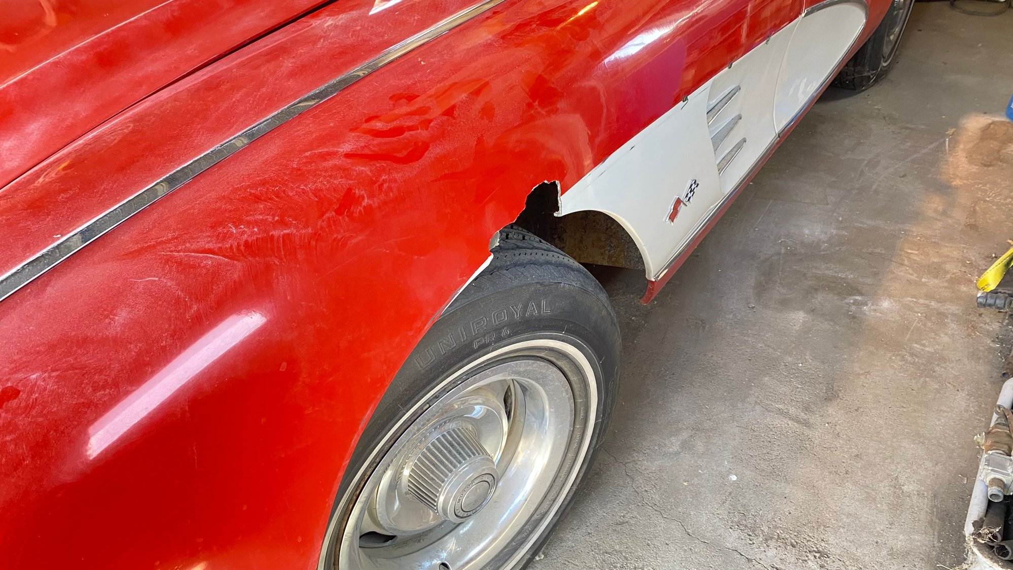 The paintwork could be handled a number of ways depending on what type of paint is on it now (Lacquer or B/C urethane), and other factors such as money and quality of car. If it's lacquer a guy could literally wetsand and blend new paint into the old. Then buff it out. If it's Single-stage urethane or enamel, a guy could also attempt to soften the existing paint and blend some new paint there using like a two-gun method. Pretty much the same if it's base/clear. Or, a guy could repaint the red part of the fender. A guy ought to be able to make the repair w/o doing a larger repaint. As I say, It all depends on the budget, goals, quality of car and so on.